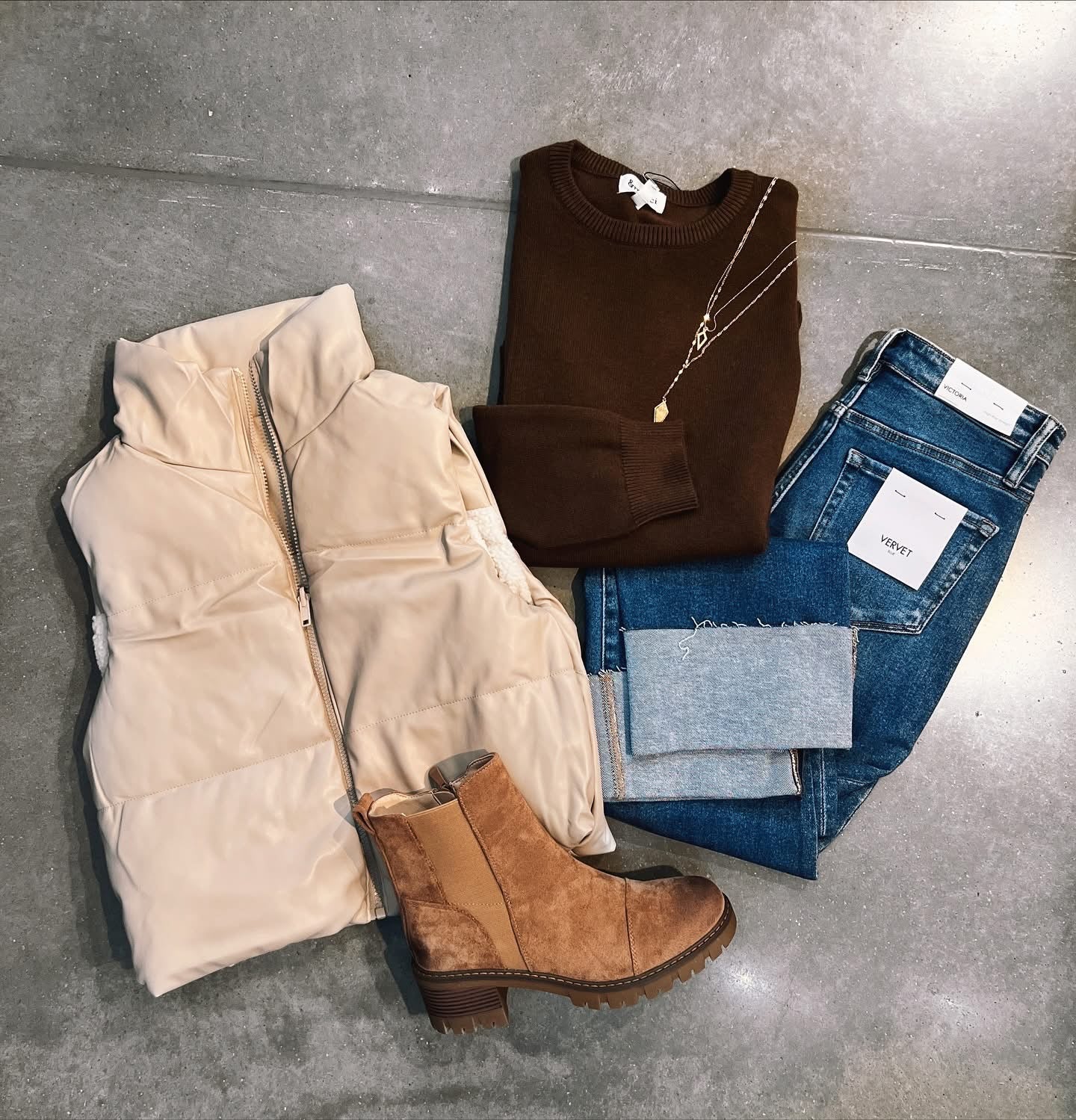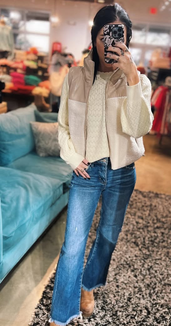 Reversible Sherpa & Faux Leather Vest Color-Ssnd Taupe Model is wearing size Small100% PolyesterMachine Wash Cold Inside Out Lay Flat to dry